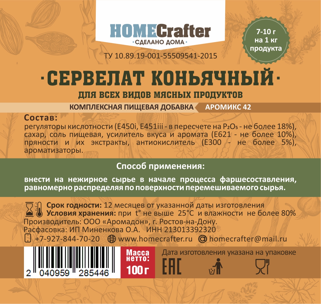 Назначение: Комплексная пищевая добавка «Аромикс 42» (Сервелат коньячный) используется при производстве всех видов мясных продуктов.