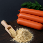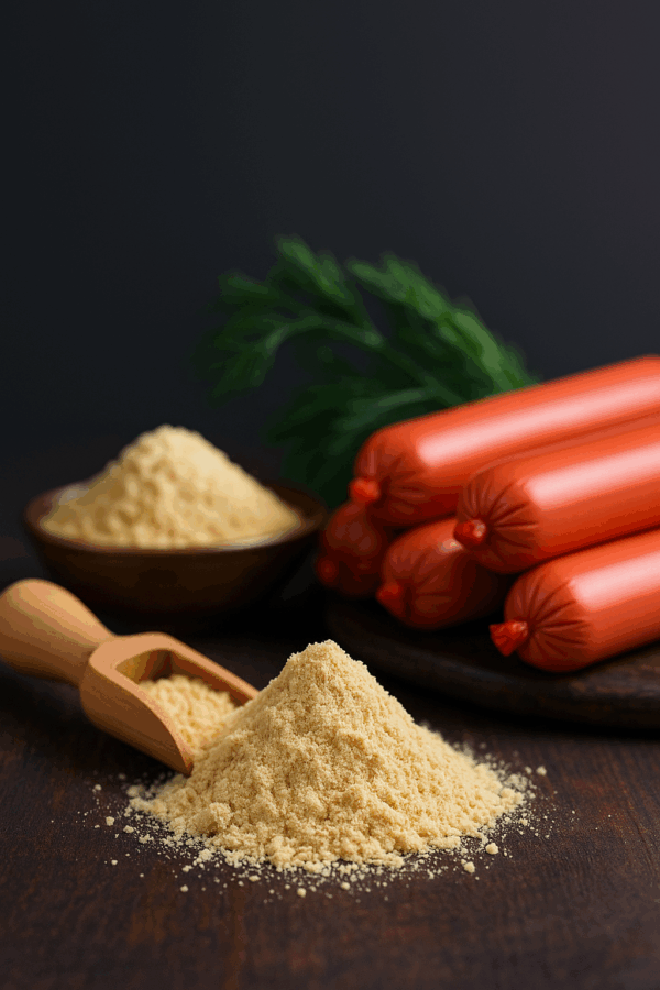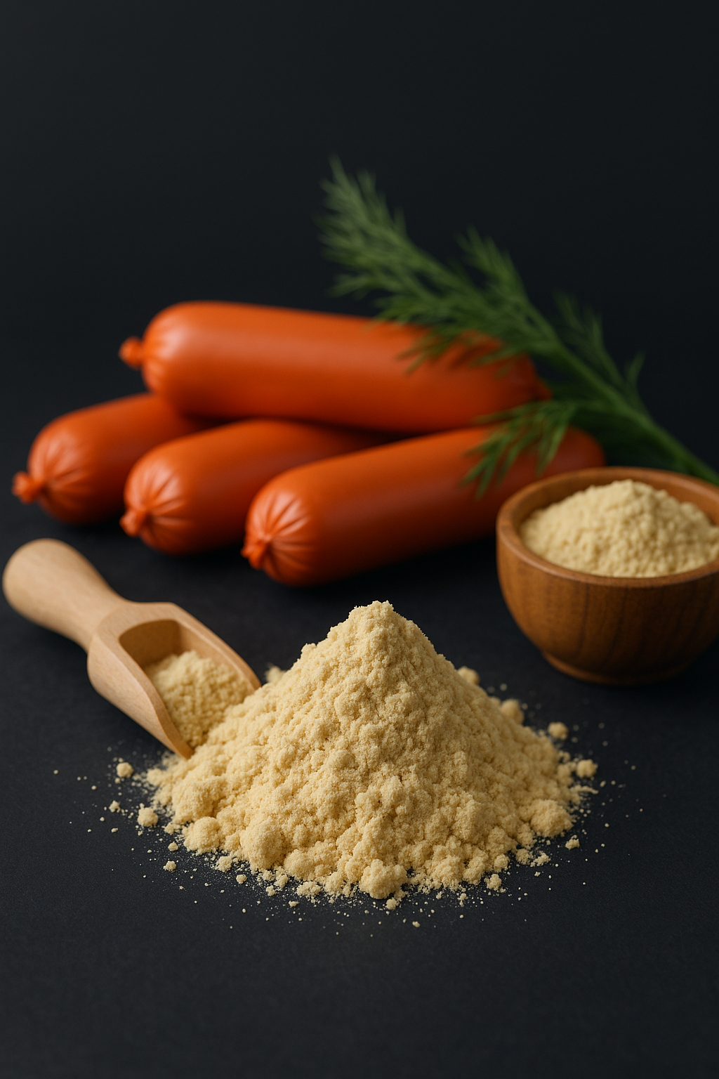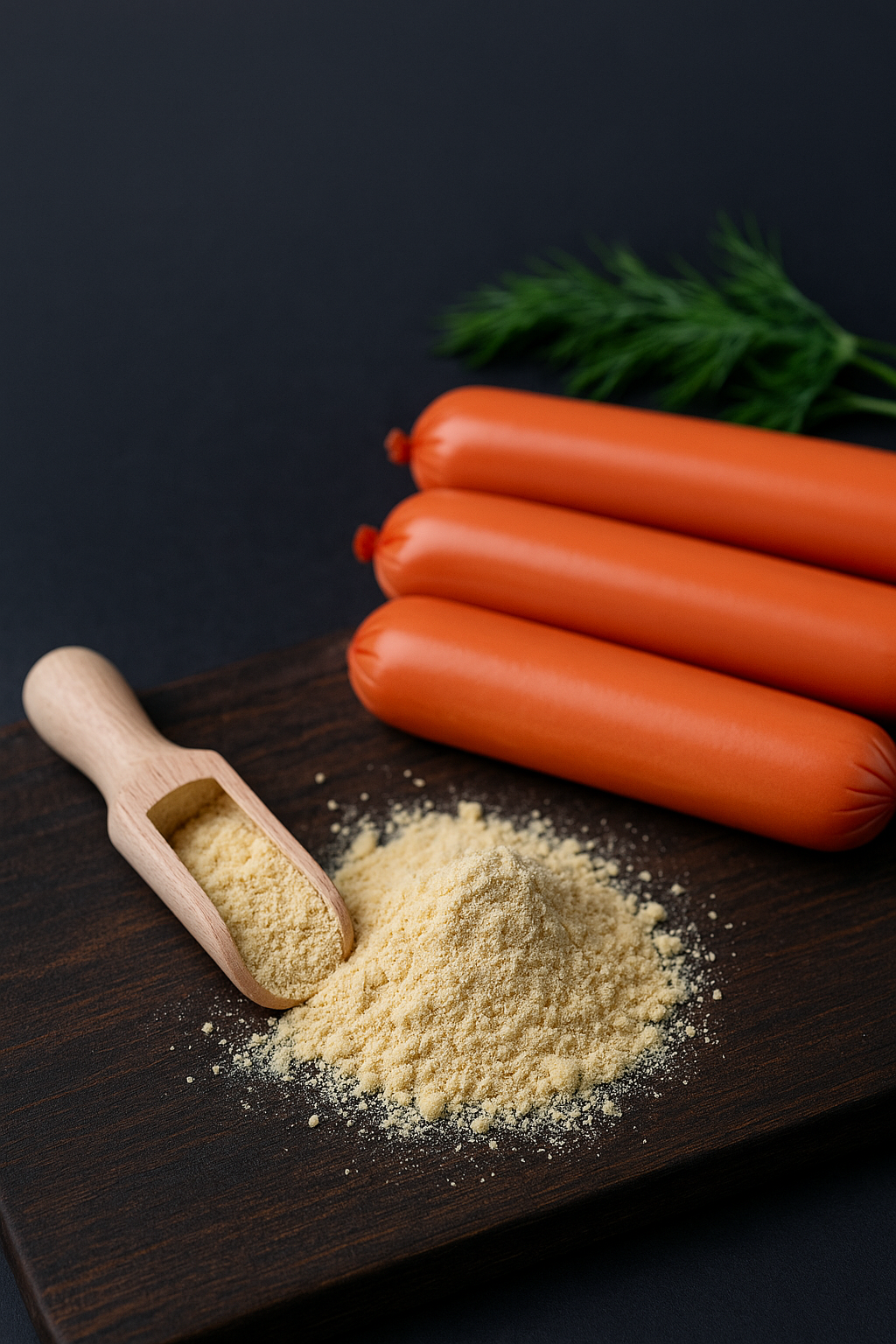 Свойства: хорошо связывает и эмульгирует мясную массу; улучшает консистенцию и нарезаемость; предотвращает образование бульонных и жировых отеков; стабилизирует цвет и придает окраску; формирует яркий, насыщенный вкус и аромат готового продукта.